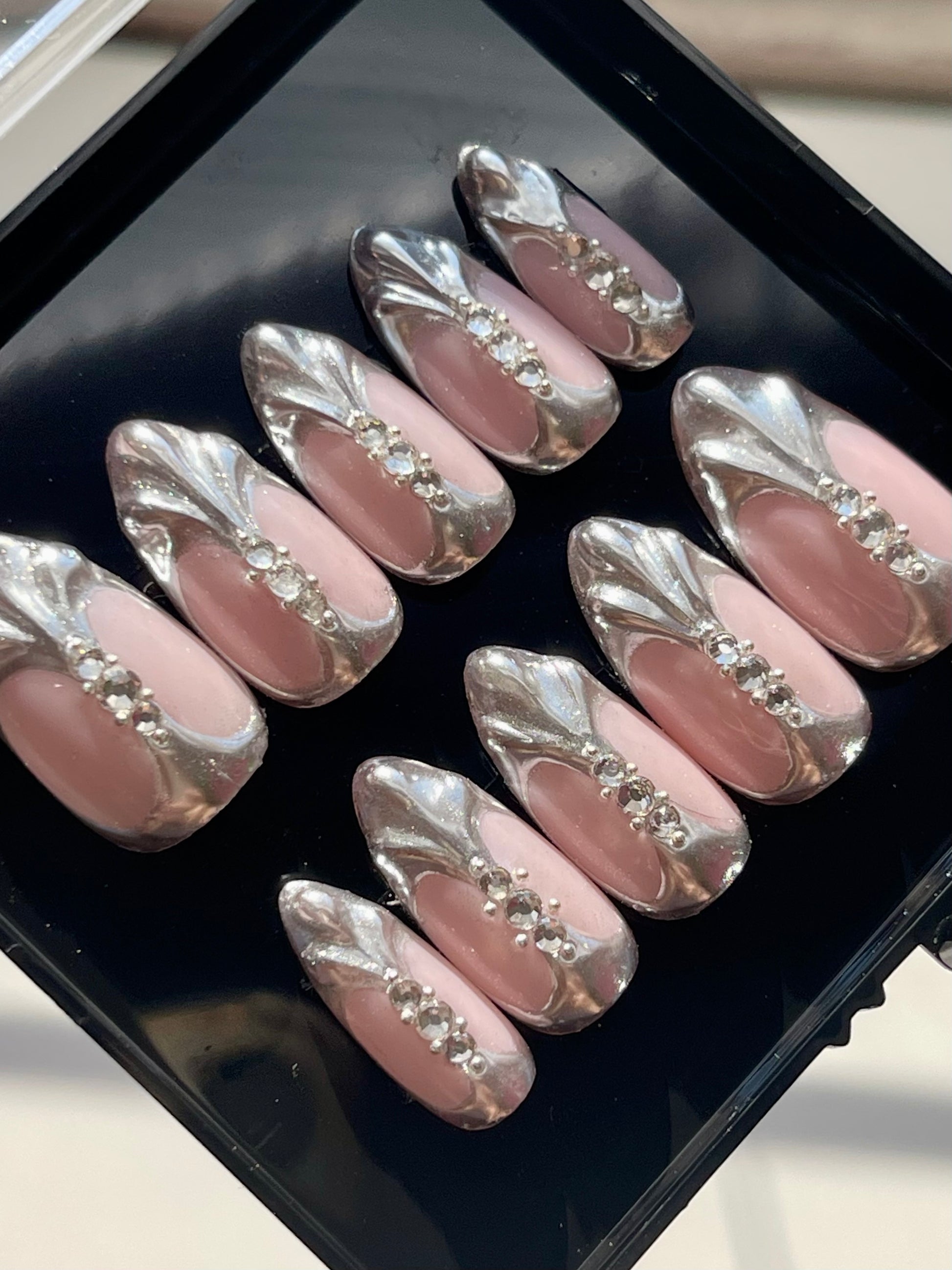 Step into understated elegance with this dreamy modernized French set. A soft, shimmering silver base meets a sleek, gilded line for just the right touch of luxe. Perfect for adding a subtle sparkle to your everyday look or elevating a special occasion, these nails blend sophistication with a modern twist. 💫